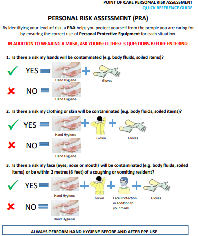 By identifying your level of risk, a Personal Risk Assessment (PRA) helps you protect yourself from the people you are caring for by ensuring the correct use of Personal Protective Equipment for each situation.